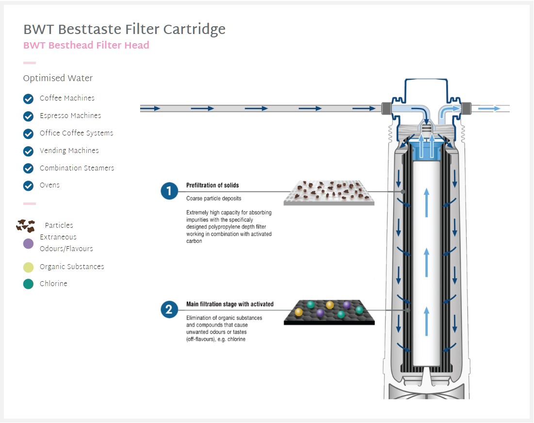 BWT besttaste filter cartridges deliver the best water for vending machines, coffee machines and water dispensers. Any existing particulates and off-flavour unpleasant tastes or odours are reliably eliminated.